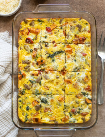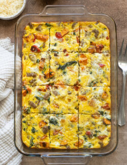 This hearty Sausage Sweet Potato Breakfast Casserole is packed with breakfast sausage, roasted sweet potatoes, bell pepper, spinach, and parmesan cheese. It’s high in...