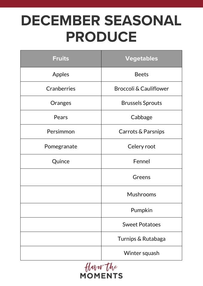 Below is a list of the fruits and vegetables that are in season during the month of December. This list may vary depending on where you are located.