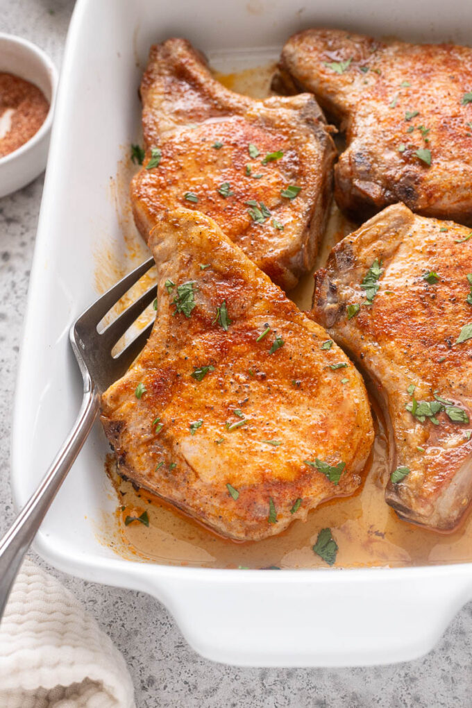 These Oven Baked Pork Chops are a hands-off approach as there’s no searing whatsoever. They’re coated with oil and a simple sweet and smoky spice blend, then they’re baked to juicy perfection.